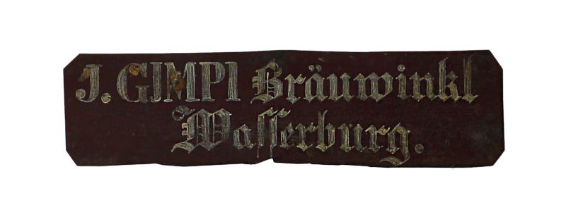 Schild der Gastwirtschaft Bräuwinkl, im Gebäude der ehemaligen gleichnamigen Brauerei von Josef Gimpl seit 1912 betrieben. Anfang 20. Jahrhundert.