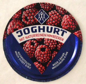 Hugo Bayer designte nicht nur Verpackungsdeckel für die vielen Joghurtsorten und anderen Milcherzeugnisse wie Quark oder Sahne der Wasserburger Molkerei, sondern auch die zugehörigen Verpackungsbecher.