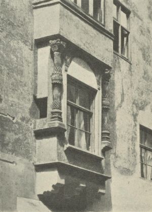 An der Ostfassade des nordöstlichen Hauses befinden sich im ersten Obergeschoss drei flache, rechteckige Erker über Konsolen, von denen die beiden seitlichen, mit Balustersäulen der deutschen Frührenaissance, sich bis zum zweiten Obergeschoss erstrecken.