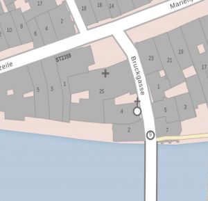 Der ausgedehnte Gebäudekomplex mit der alten Hausnummer 52 steht an der Ecke zwischen dem Marktplatz, dem heutigen Marienplatz, und der Straße zur Innbrücke, der Bruckgasse. Er setzt sich aus mehreren älteren Häusern zusammen. Das nordöstliche und vielleicht das südöstliche dieser Häuser waren der erste Sitz des herzoglichen Mautners, also des vom Herzog bestellten Einnehmers der Zölle, vor allem aus der Benutzung der Innbrücke.