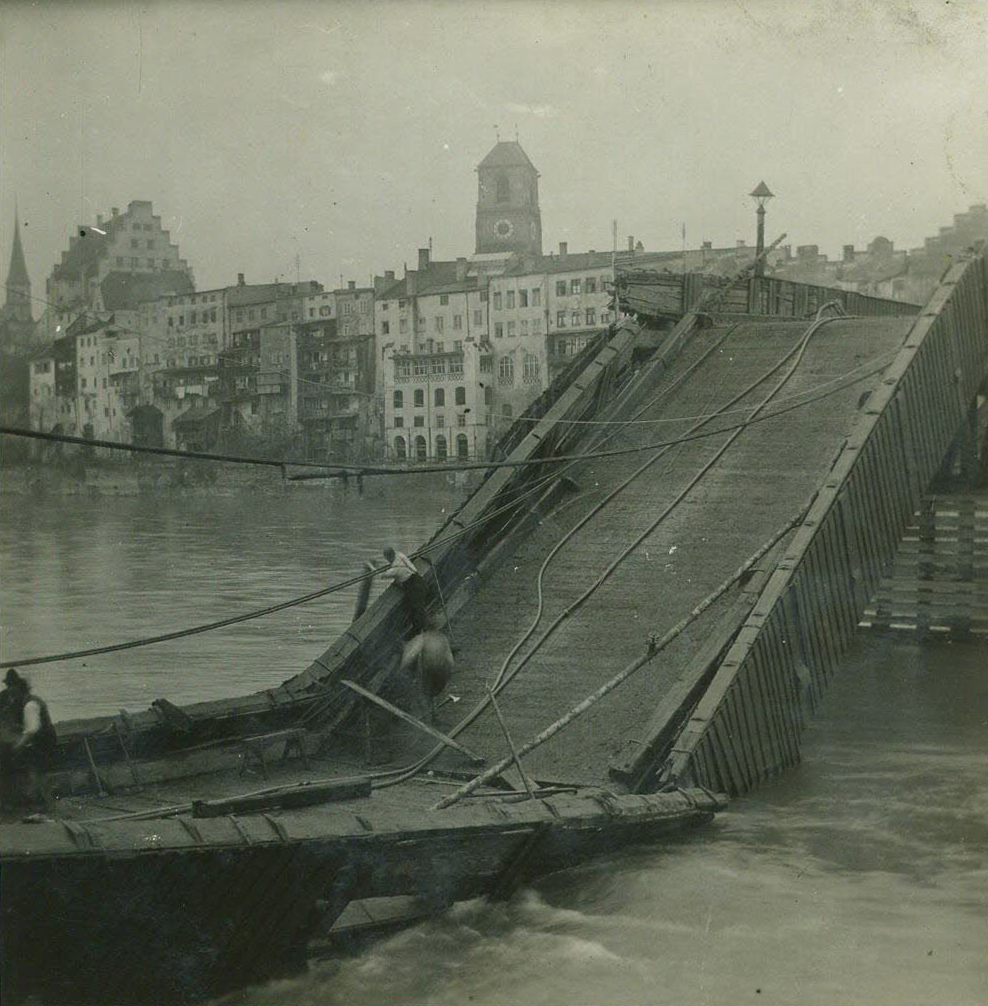 Die Innbrücke nach der Sprengung am 2. Mai 1945. StadtA Wasserburg, Bildarchiv DO295 5074.