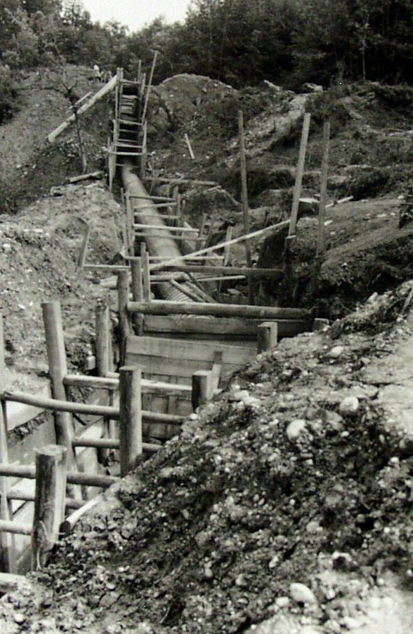 Holzwasserrohrverlegung vom Wuhrstauwerk zum Krafthaus am Wuhrbach 6. Die Arbeiten wurden unter Zuhilfenahme französischer Kriegsgefangener im Jahr 1940 durchgeführt. Die Holz-Rohre wurden 1956 durch Eternitrohre ersetzt, StadtA Wasserburg a. Inn, Album-001-856. Fotograf: stadteigene Fotografie.