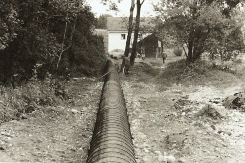 Holzwasserrohrverlegung beim Krafthaus am Wuhrbach 6, 1940, StadtA Wasserburg a. Inn, Album-001-856. Fotograf: stadteigene Fotografie.