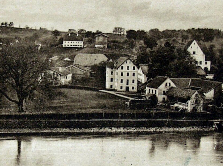 Die in steinbauweise 1852 neu errichtete Mahlmühle (ehemalige Kleinmühle) in der Zeit der Nutzung als Sägemühle sowie die zur Kunstmühle ausgebaute Schredlmühle nebst Anger, von Norden, um 1900, StadtA Wasserburg a. Inn, Album-002-1147.