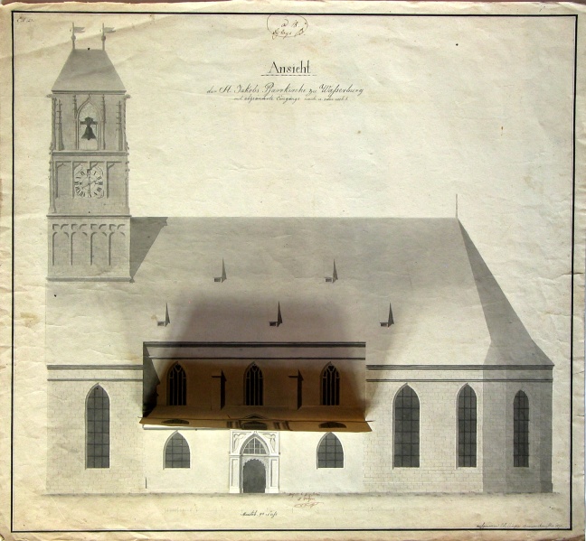 Ansicht von Süden mit den geplanten Umbauten, Simon Millinger 1825. Museum Wasserburg, nicht inventarisierter Bestand.