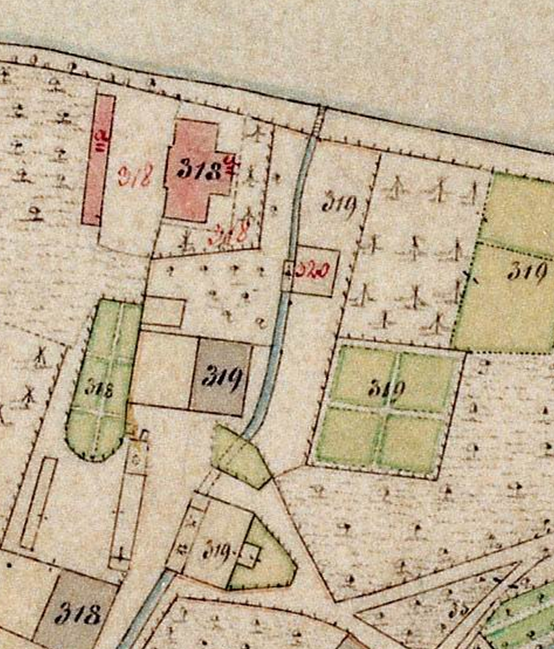 Die Gebäude 320 und 319 im Vermessungsplan 1854. © Landesamt für Digitalisierung, Breitband und Vermessung.