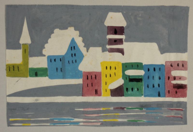 Hugo Bayer, Wasserburg im Winter, Zeichnung auf Papier. Ein großer Teil der von Bayer gefertigten Wasserburg-Zeichnungen ist in weihnachtlicher bzw. winterlicher Szenerie angesiedelt – hier gibt es wie zu erwarten mehrere Postkarten-Ausführungen. Hier reicht die künstlerische Bandbreite von romantisch angehauchten zu klaren grafischen Szenenbildern, wobei Bayer es durchwegs bei allen gelingt eine atmosphärische sowie authentische Stimmung zu erzeugen. So zeugen hier die mit Schnee bedeckten bunten Gebäude der Burg, St. Jakob und Häuser direkt am Inn von einer reduzierten, dabei allerdings sehr lebhaften Formensprache.