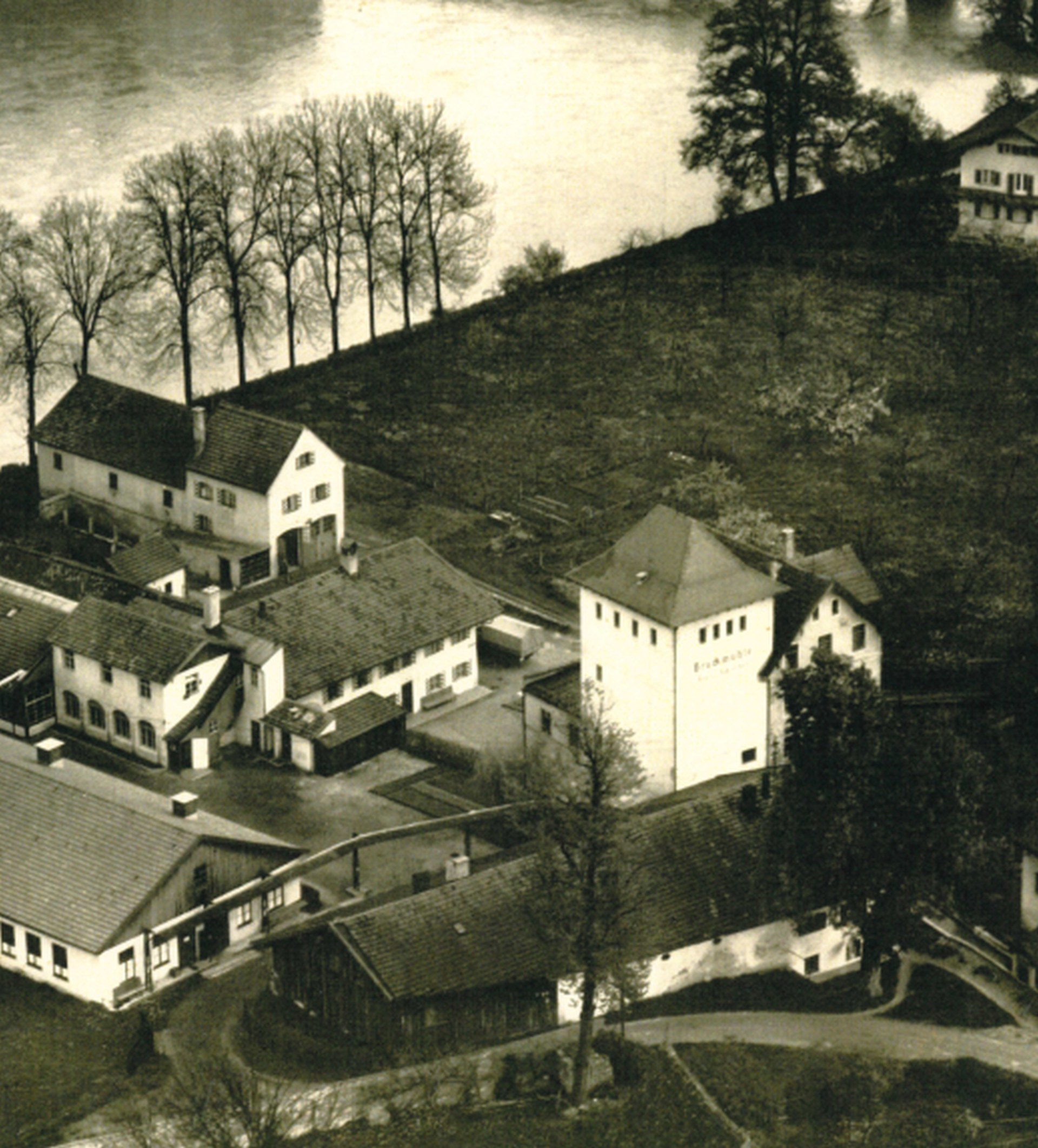 Luftbildausschnitt der zur Bruckmühle gehörigen ehemaligen Kleinmühle, Situation Ende der 1950er Jahre, StadtA Wasserburg a. Inn, DO-397. Fotograf: Luftbild Hans Bertram.