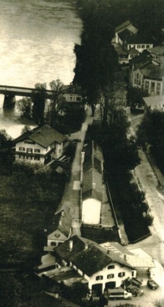 Nach dem 2. Weltkrieg wurde der Betrieb Knagge und Peitz Werkstätten für Herrenbekleidung fortgeführt, hier aus der Luft fotografiert, Situation Ende der 1950er Jahre, StadtA Wasserburg a. Inn, DO-397. Fotograf: Luftbild Hans Bertram.