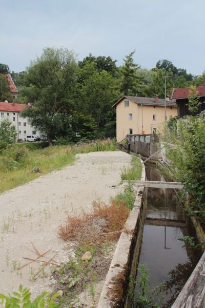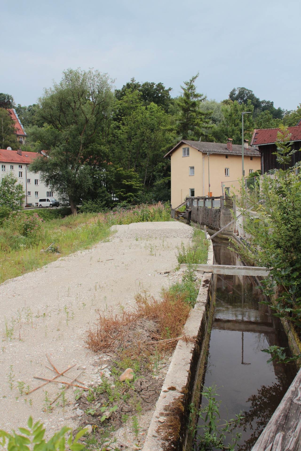 Blick entlang des Mühlkanals (Mühlbach) zur ehemaligen Walchmühle, Juli 2022. Das Foto entstand in Höhe des 2022 abgerissenen ehemaligen Bleich- und Wäschereigebäudes am Steinmühlweg 1, Foto: Matthias Haupt.
