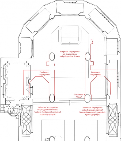 Fundamente des Vorgängerbaus. Zeichnung: Gerald Dobler auf der Basis des Aufmaßes von Stiegler, Unterhaching, 2012.