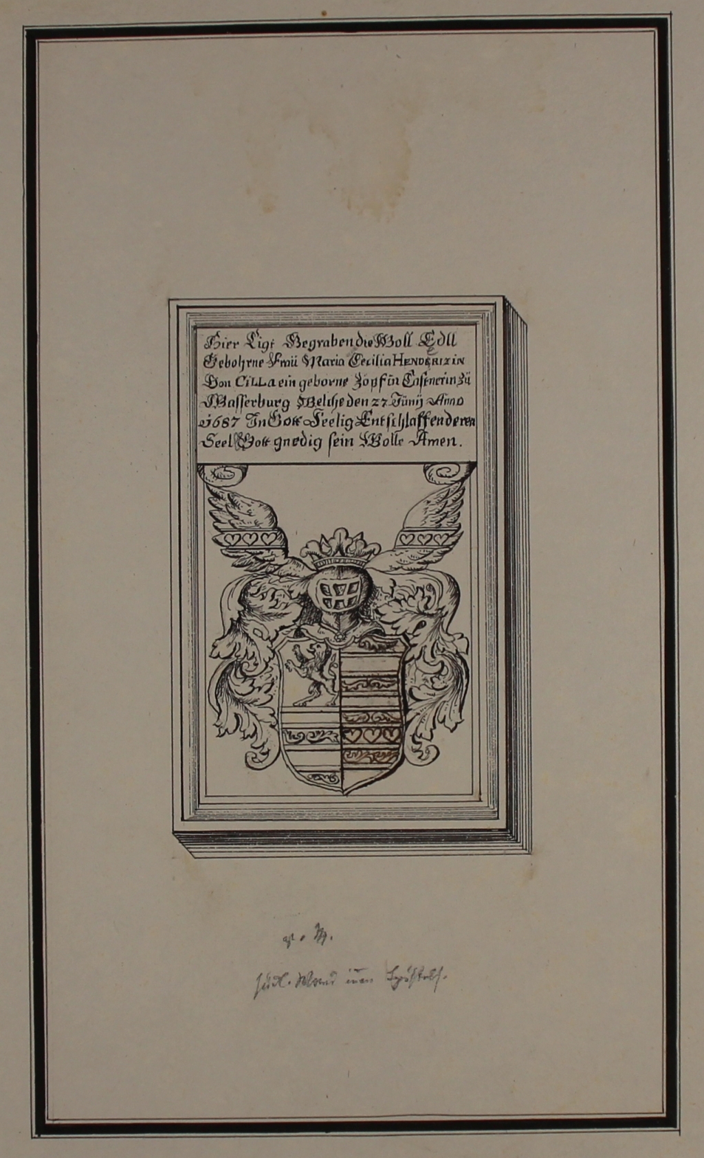 Grabdenkmal, Nr. 104, von Cilla, 1687, Skizze Springer. Zustand um 1830 in: StadtA Wasserburg a. Inn, I1b598.