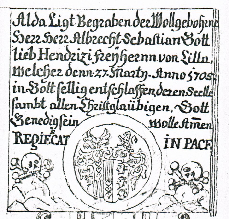 Grabdenkmal, Nr. 105, von Cilla, 1705, Skizze Lobming. in: Lobming, Epitaphien Pfarrkirche S. Jacobi Nr. 54. Zustand Ende 18. Jahrhundert.