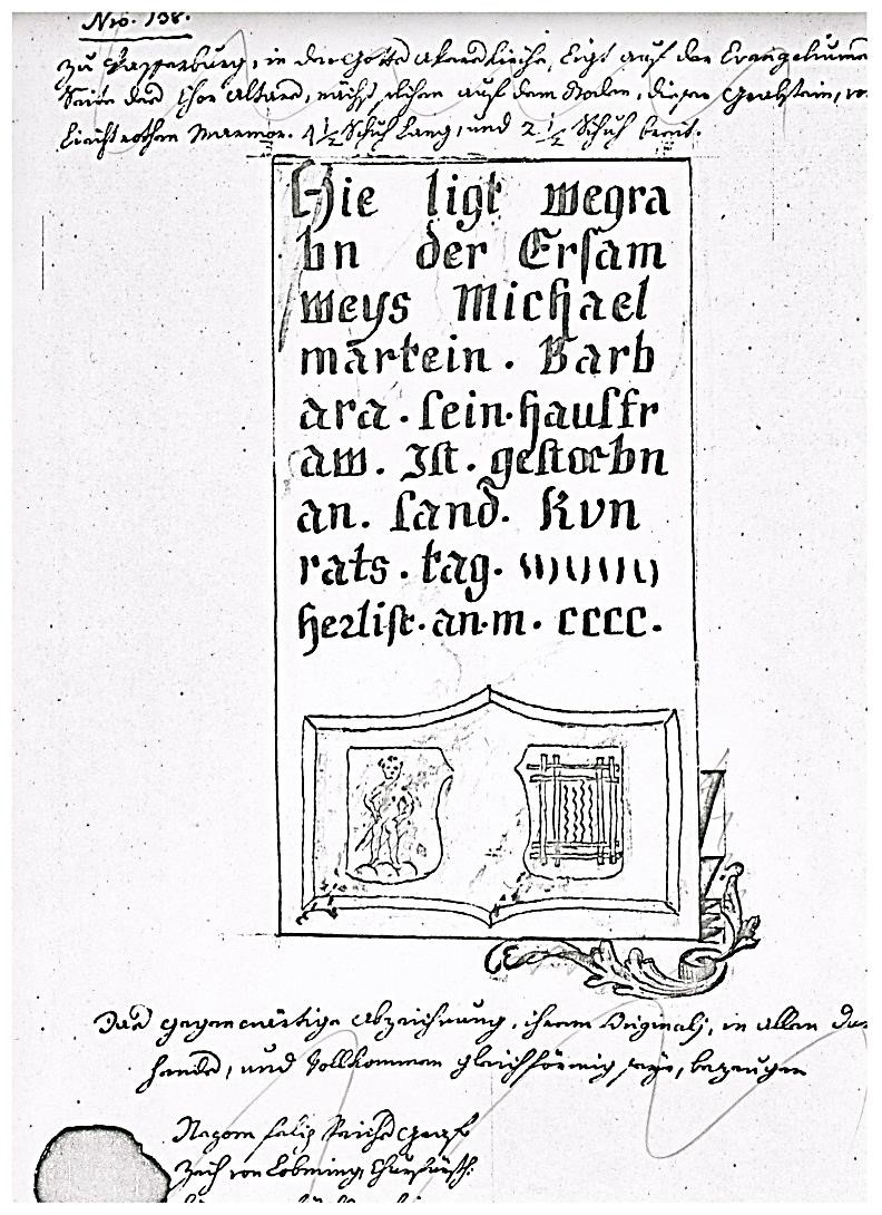 GGrabdenkmal, Nr. 92, Martein, 15. Jh, Skizze Lobming in: Lobming, Epitaphien Pfarrkirche S. Jacobi Nr. 138. Zustand Ende 18. Jahrhundert.
