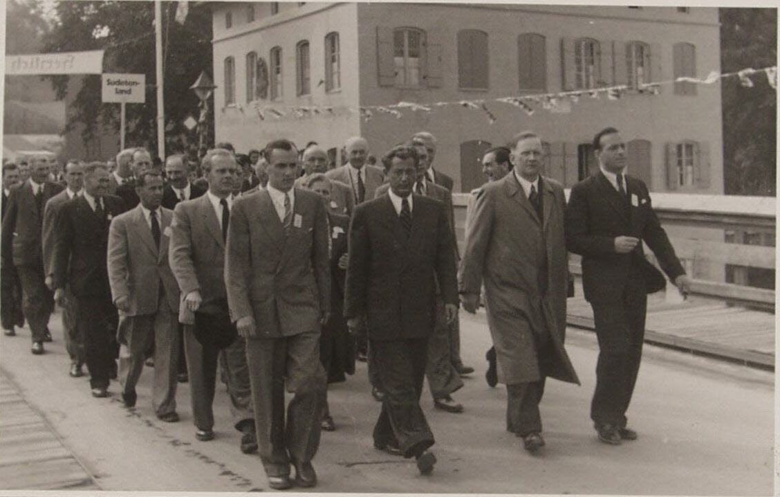 Landrat Heinrich Stulberger (Zweiter von rechts) und Josef Kriegisch (Vierter von rechts) an der Spitze des Festzuges zum Wasserburger Heimatfest im Jahr 1949. StadtA Wasserburg a. Inn, Album-034.
