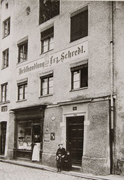 Mehlhandlung Schredl, Färbergasse 16, ca. 1905-1910, StadtA Wasserburg a. Inn, Ib2-3232. Fotograf: unbekannt.