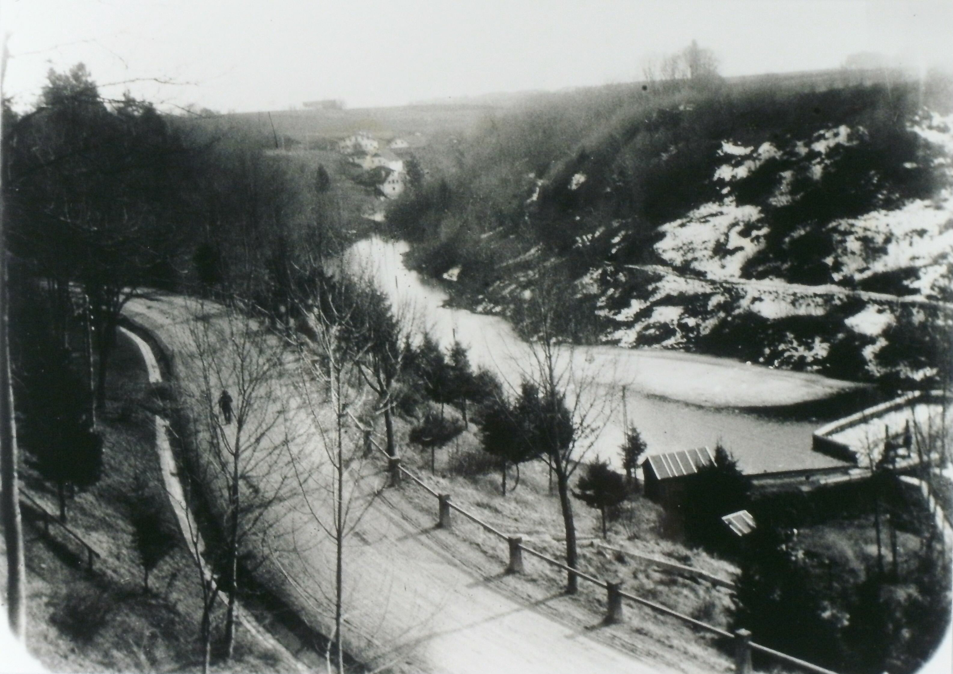 Blick auf den Staudamm für die Wasserkraftanlage Wildgruber, um 1925/1928, StadtA Wasserburg a. Inn, Il2-M1-M4. Fotograf: unbekannt.