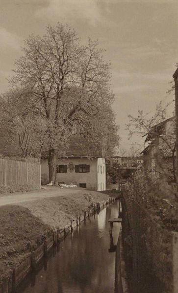 Blick auf die Schredlmühle vor dem Bau des Silos entlang des holzgefassten (noch nicht betongefassten) Mühlbachs, um 1910. Im Bildhintergrund die Kleinmühle, StadtA Wasserburg a. Inn, Im1-3396. Fotograf: unbekannt.
