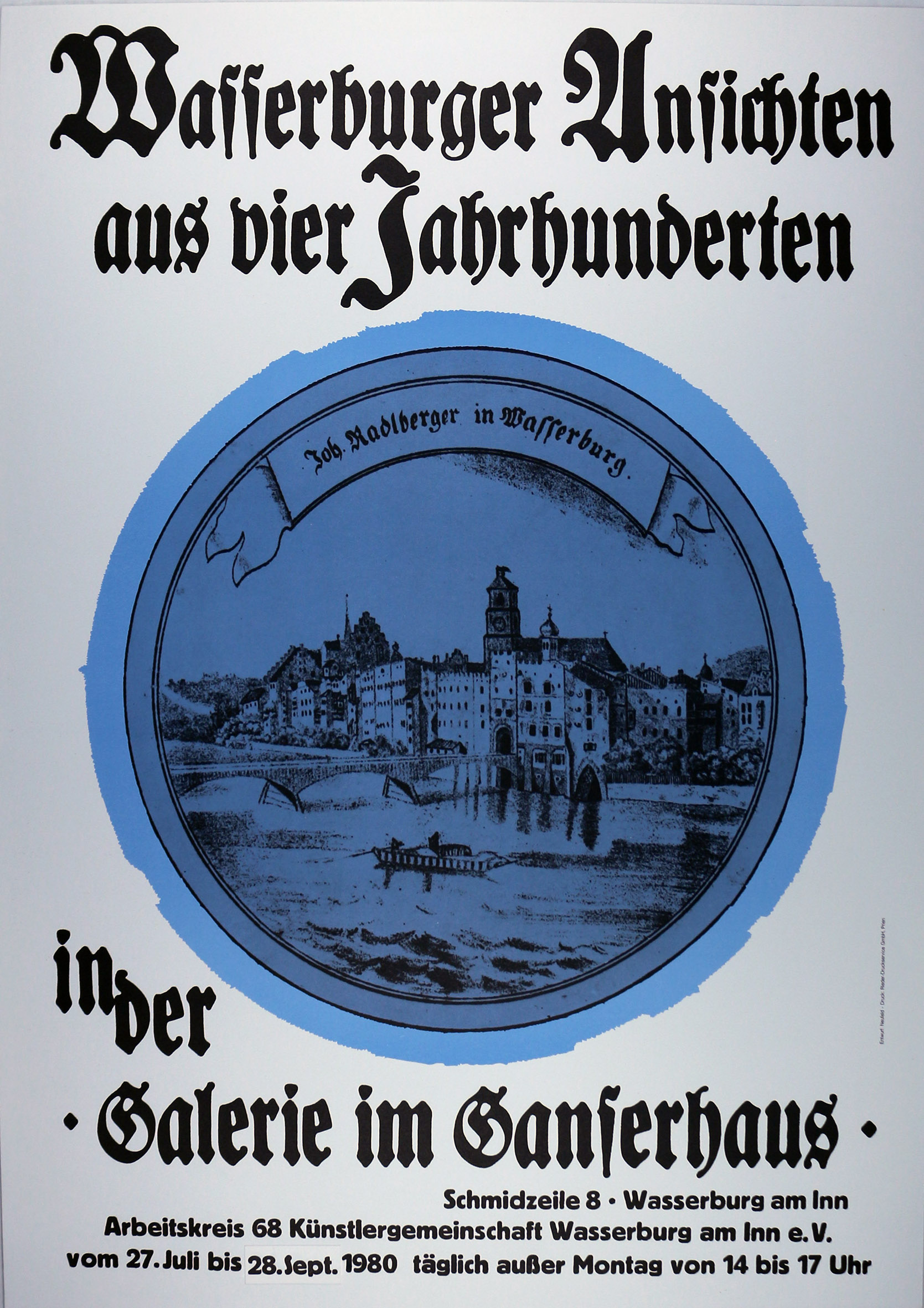 Plakat für die Ausstellung "Wasserburger Ansichten aus vier Jahrhunderten", die der Arbeitskreis 68 – Künstlergemeinschaft Wasserburg am Inn e.V. 1980 in seiner Galerie im Ganserhaus zeigte, StadtA Wasserburg a. Inn, VPla0863. Gestaltung: unbekannt, Repro: Lena Hauser.