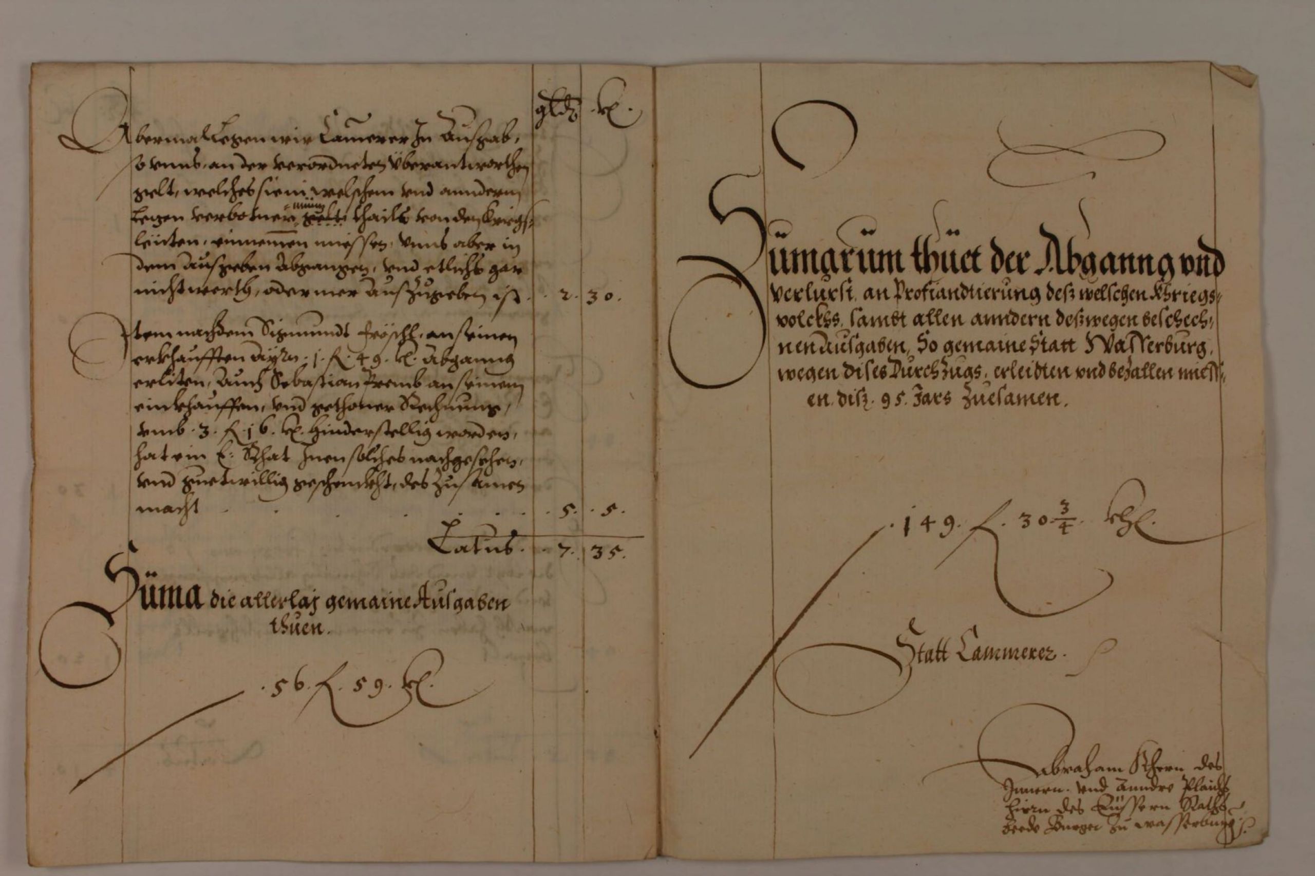 Haubt Rechnung und Summarische Beschreibung aller Ausgaben und Uncosten“ des Durchzugs der Truppen des Hz. von Mantua, Rechnung von 1595 (Auszug). StadtA Wasserburg a. Inn, I1b348.