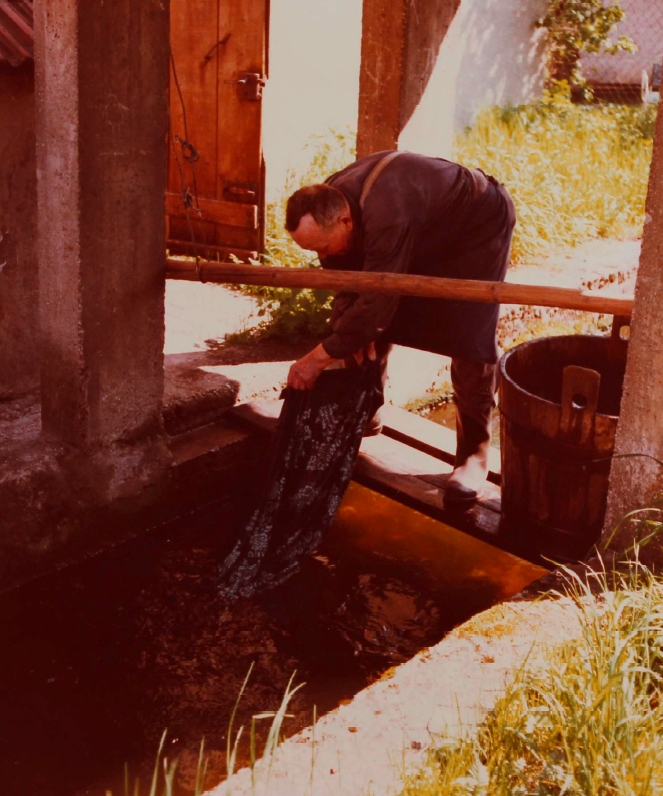 Der letzte Färbermeister und Blaudrucker Josef Unterauer beim letzten Arbeitsschritt des Blaudrucks - dem Ausschweifen/Auswaschen des Papps im Mühlbach -, ca. 1980, StadtA Wasserburg a. Inn, Il2-M1-M4. Foto: Familie Unterauer.