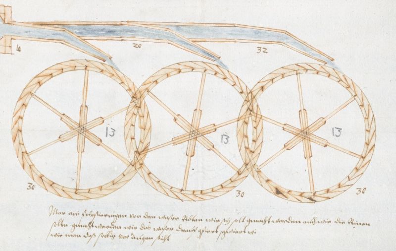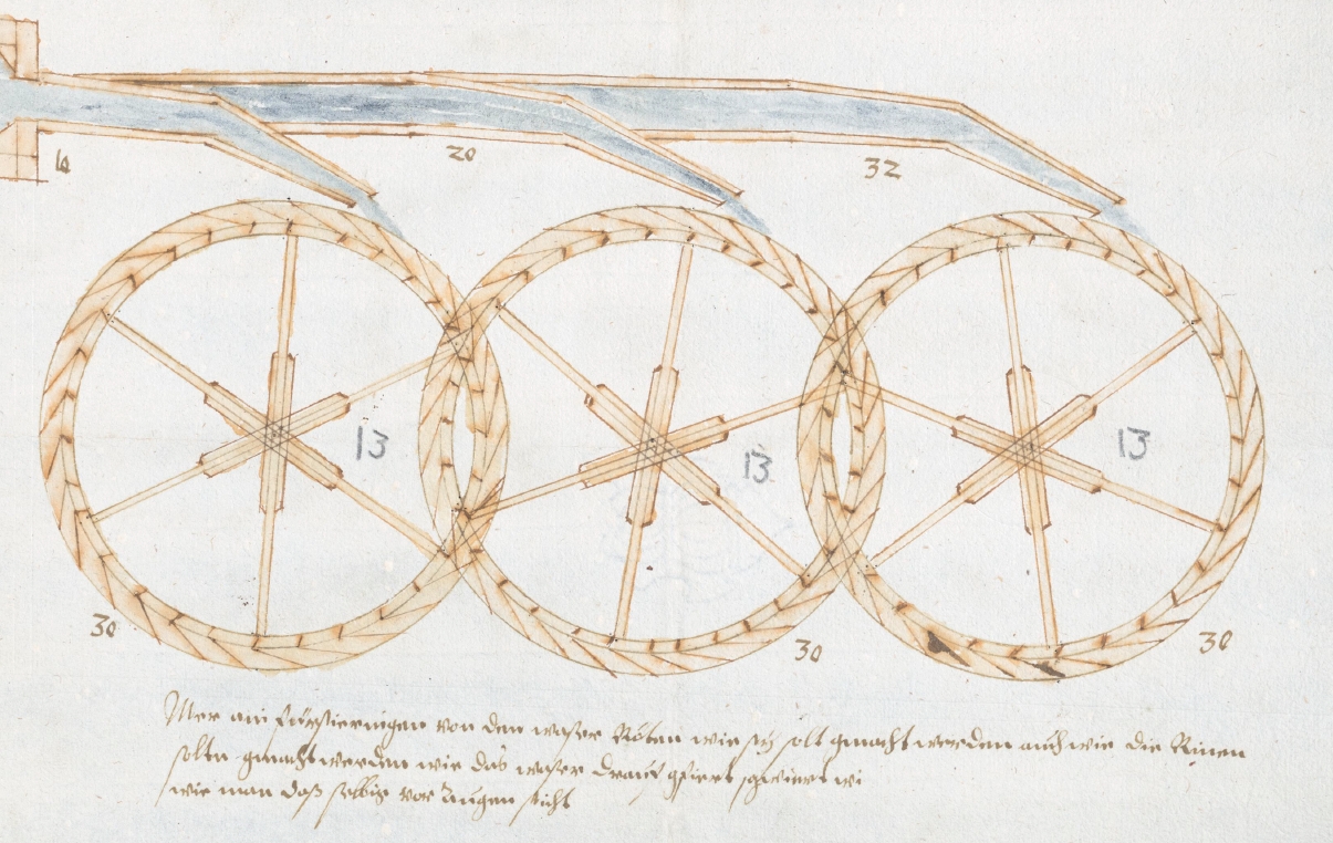 Konstruktionszeichnung von drei oberschlächtigen Wasserrädern einer Mahlmühle und "wie das waser drauf gefiert" wird, 1610, StadtA Wasserburg a. Inn, I1b207.
