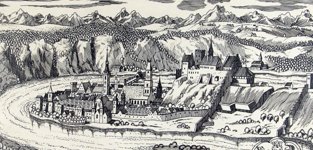 Die Wasserburger Stadtbefestigung mit Zwerchmauern und innerer Ringmauer, Stadt und Burg, 1685; nach der Vorlage eines Stiches von Matthäus Merian d. Ä. 1648.