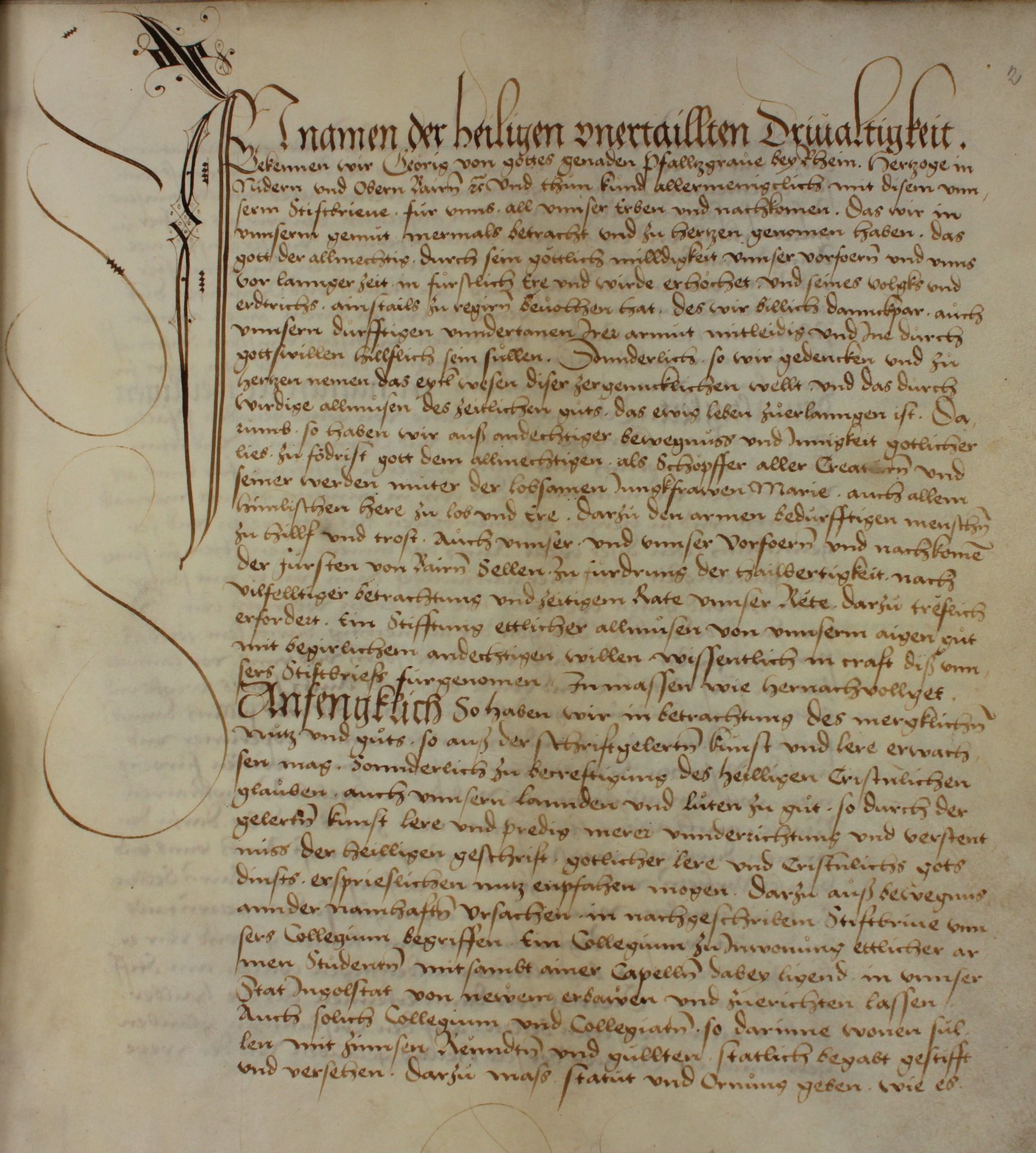 Erste Seite des Stiftbrief der Herzog-Georg-Stiftung, StadtA Wasserburg a. Inn, I1a1181.