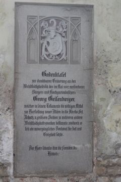 | Gedenktafel zur dankbaren Erin̅erung an den Wohlthätigkeitssin̅ des im Mai 1862 verstorbenen Bürgers und Hochgartenbesitzers Georg Geisenberger, welcher in seinem Testamente die nöthigen Mittel zur Herstellung neuer Altäre in die Kirche Sct. Achatz, u. größere Sum̅en zu mehreren andern Wohlthätigkeitszwecken bestimmte, wodurch er sich ein unvergängliches Denkmal für Zeit und Ewigkeit setzte. Der Herr schenke ihm die Freuden des Him̅els! |