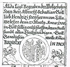 | Alda Ligt Begraben der Wollgebohrne Herr Herr Albrecht Sebastian Gott: lieb Hendrizi Freÿherrn von Cilla, Welcher denn 27. Marty. Anno 1705 In Gott sellig entschlaffen, deren Seelle Sambt allen Christglaübigen, Gott Genedig sein wolle Am̅en REQUIESCAT IN PACE |