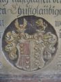 Polychromes Wappen in Kreis, flankiert von Totengebein. Mutmaßliches Allianzwappen der von Cilla/von Golz: Gespalten und geteilt, jeweils mit gekröntem Spangenhelm, rechts Adlerflug mit Herz zwischen den Schwingen, rechts schreitender Löwe. 1/3 wechselnd-drei Herzen übereinander, fünffach gespalten; 2 drei Köpfe mit Stirnbinde übereinander. Die Fünffach-Spaltung entspräche beim Wappen der Maria Caecilia Hendrizi einer horizontalen Teilung.