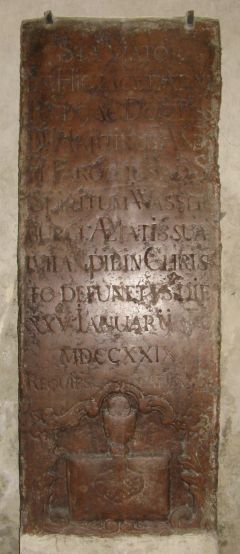 Bleib stehen, Wanderer, und schau! Hier liegt der hoch- ehrwürdige und hochgelehrte Herr Martin And- Re, Pfarrer bei Hl. Geist zu Wasser- Burg, seines Alters 57 Jahre fromm in Chri- stus verschieden am 25. Januar im Jahre 1729 Er ruhe in Frieden. |