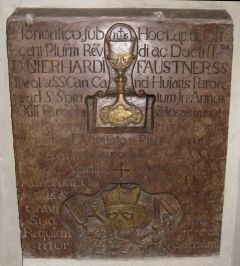 Unter diesem ehrwürdigen Stein liegen die Gebeine Des hochwürdig(st)en und hochgelehrten Herrn Erhard Faustner, der allerheiligsten Theologie [und] des Canonischen Rechts Kandidat, dieser Pfarrei zum Hl. Geist 23 Jahre lang sehr eifrigen Priesters, der nach Mühen im Weinberg des Herrn, die er treu bis ans Ende ausgehalten hatte, fromm im Herrn entschlafen ist im Jahre 1775 am 19. April im Alter von 70 Jahren. Deshalb bitten wir für diesen sowohl an Jahren als auch an Verdiensten so würdigen Mann wegen seines günstigen Vorzeichens um die ewige Ruhe. |