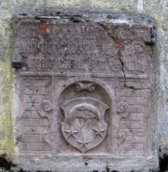 In einer torähnlichen Rundbogennische mit Volute im Scheitel und seitlichen Ausschwüngen einer durch Quadrierung angedeuteten Mauer das Wappen des Verstorbenen. Darüber die dreizeilige Inschrift.