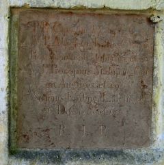 Einfache, quadratische Rotmarmorplatte mit schlichter Inschrift, in die Wand eingelassen.
