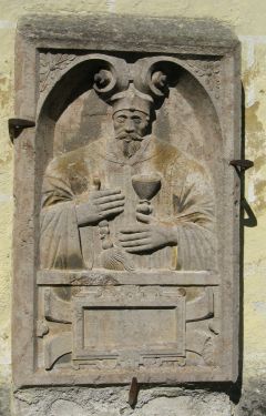 Hochrechteckiger Stein mit etwas plumper Darstellung des Geistlichen im Ornat. Brustbild, in der rechten Hand eine Paternoster-Schnur mit Quaste haltend, in der linken den Kelch. Birett. Kopf im Verhältnis zum Oberkörper zu klein. Kinn- und Schnurbart. Über dem Birett stoßen zwei Voluten zusammen. In den Zwickeln Blätter. Die Inschrifttafel ist nicht mehr lesbar.