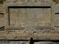 Während das Relief mit der Darstellung des Verstorbenen sehr gut erhalten ist, hat die schmale Inschrift durch Witterungseinflüsse und Ausblühungen einen Totalschaden erlitten – es sind keinerlei Worte mehr zu entziffern.