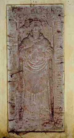 Hochrechteckige Grabplatte mit umlaufender Inschrift, in der Mitte der stehende Verstorbene mit Kelch in der Hand und Segensgestus.