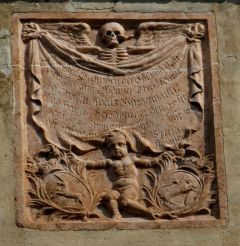 Ein geflügeltes Totengerippe hält ein Tuch ausgebreitet, auf dem die Inschrift verzeichnet ist. Unter dem Tuch schreitet ein Knabe hervor und hält die beiden Wappen in den unteren Ecken. Typisch barocke Darstellung mit Vergänglichkeitssymbolik.