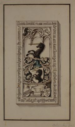 In den Zwickeln: rechts Wappen der Perkhofer, links springender Hund. Am Sockel Wappen und Spruchband All Hernach.