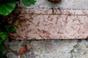 Hochrechteckige Rotmarmorplatte, randlos, ohne Schmuckelemente, mit feiner Schrift beschrieben, Ausbrüche, Beschädigung durch Efeu. Zwischen Epitaph und unterer Textplatte kleines Weihwasserbecken aus Rotmarmor in die Stadtmauer eingelassen.