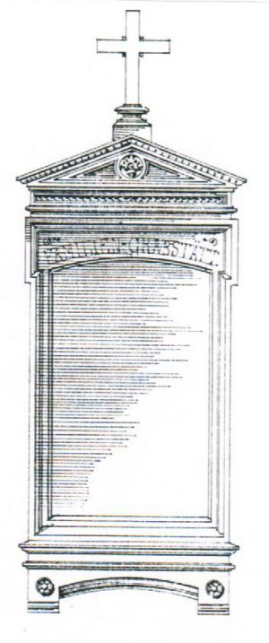 Hochrechteckiger Stein auf Sockel mit Segmentbogen. An den oberen Ecken schmale Überstände. Abschluss durch Dreieckgiebel mit bekrönendem Kreuz.