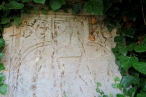 Durch Verwitterung und den Bewuchs ist außer dem Symbol des geistlichen Standes und den beiden Schmuckblättern nichts mehr zu erkennen.