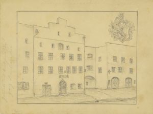 Das Gasthaus/Bräuhaus zum unteren Bären besaß als Hausschild einen über der Türe eingelassenen Rotmarmorstein flankiert von zwei aufrecht stehenden Bären (Löwen?). Anlässlich einer Fassadenrenovierung war der Stein herausgelöst worden, dabei entdeckte man auf der Rückseite das Relief. Durch den Besitzerwechsel wurde auch der bisherige Wirtshausname hinfällig, sodass man nun das Relief sichtbar ließ. Die Fassade gibt eine kolorierte Zeichnung von J. Springer[1] etwa um 1840/50 wieder.