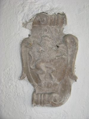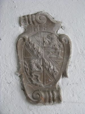 Zwei zusammengehörige Wappenkartuschen, die aus einem größeren Epitaph herausgebrochen und im Rückgebäude sekundär eingemauert worden sind.