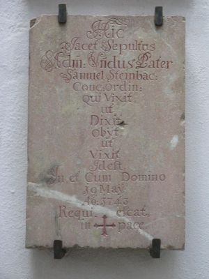 Hier liegt begraben der hochwürdigste Pater Samuel aus Steinbach Prediger, der gelebt hat, wie er gepredigt hat, der gestorben ist, wie er gelebt hat, das heißt in und mit dem Herrn, am 19. Mai im Jahre 1743 Er ruhe In Frieden. |