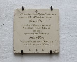 | [Zum/im] Andenken zweyer Brüder Pfründtner aus dem heil. Geistspitale, des ehrbaren Franz Eder ehemaligen Wagners dahier gest. den 1. März 1838, 74 Jahre alt und des ehrengeachteten Jünglings Anton Eder Sailergesellen, gest. den 28. Sept. 1842 im […]ten Jahre seines Alters. R(equiescant). I(n). P(ace). |