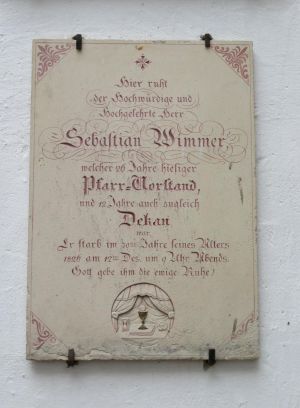 | Hier ruht Der Hochwürdige und Hochgelehrte Herr Sebastian Wimmer, welcher 26 Jahre hiesiger Pfarr=Vorstand, und 12 Jahre auch zugleich Dekan war. Er starb im 70ten Jahre seines Alters 1826 am 12ten Des. um 9 Uhr Abends. Gott gebe ihm die ewige Ruhe! |