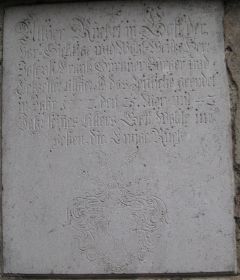 Helle Marmorplatte, bis zum Profil eingemauert, Oberfläche grau verwittert, Schrift mit flachem Wappen; Ober- und Unterlängen jeweils in Punkt endend.