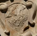 In den vier Ecken Wappen auf typischen Zürn-Kartuschen (nach Volker Liedke[4] auf Martin Zürn[5] zurückgehend), die allerdings so schon bei Jeremias Hartmann[6] auf dem Altar in der Zellerreiter Schlosskapelle von 1620 vorkommen. Oben rechts: geviertet, Allianzwappen: Altershamer Wappen und Adler mit gespreizten Ständern und Schwingen (vermutlich Adelzhauser/Adelszhausen = goldener gekrönter weißer Adler in silber – nach Apian[7] auch ohne Krone – Adelsgeschlecht in gleichnamigem Ort im Ldkr. Aichach-Friedberg, als Beamten in Dachau tätig.[8] Die familiären Beziehungen Adelzhauser-Altershamer konnten bislang nicht geklärt werden). Oben links: geviertet, Allianzwappen: Keck/Kech/Köckh in Prunn, halber Mann mit Kegelhut, einen Arm in die Hüfte gestemmt, mit der anderen Hand ein Schwert haltend, zwei übereinander liegende Winkel (vergleiche auch Grabdenkmal, Nr. 39, Keck, 1560). Unten rechts: Wappen der Kern mit Kessel und Flammen sowie schreitendem, gekröntem Löwen (Wappen nach 1611, vergleiche Inschrift in Grabdenkmal, Nr. 25, Kern, 1611). Angeblich war das Stammwappen der Kern ein goldener Löwe mit doppeltem Schwanz in schwarzem Feld. Nachdem die Kern die Jungwirt in Burghausen beerbt hatten, nahmen sie deren Wappen (Feuerkessel) in ihr Wappen auf. Unten links: geteilt, oben Vogel mit Sonne, unten Tannenbaum auf Berg (bislang nicht gedeutet, möglicherweise das seiner 1. Gemahlin Maria Lucia NN, gest. 1655)